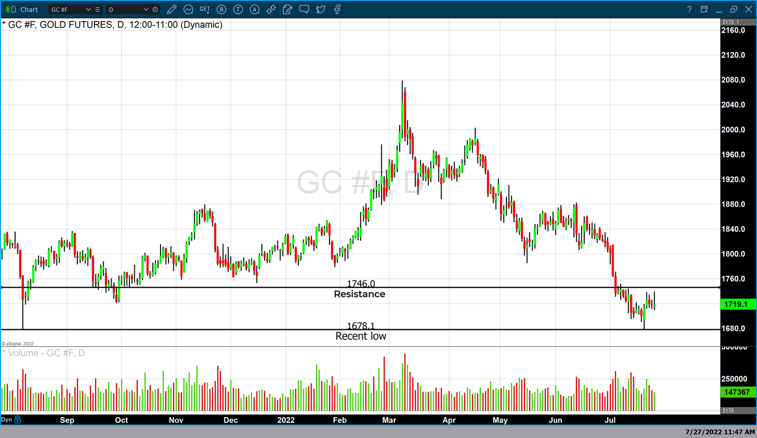 Gold traded to a low of $1709.10 in overseas trading before the release of today’s report. Gold began to gain strength immediately following the release of the report and strengthened as Powell spoke during the press conference. Gold futures basis the most active August contract traded to a high of $1739.60.