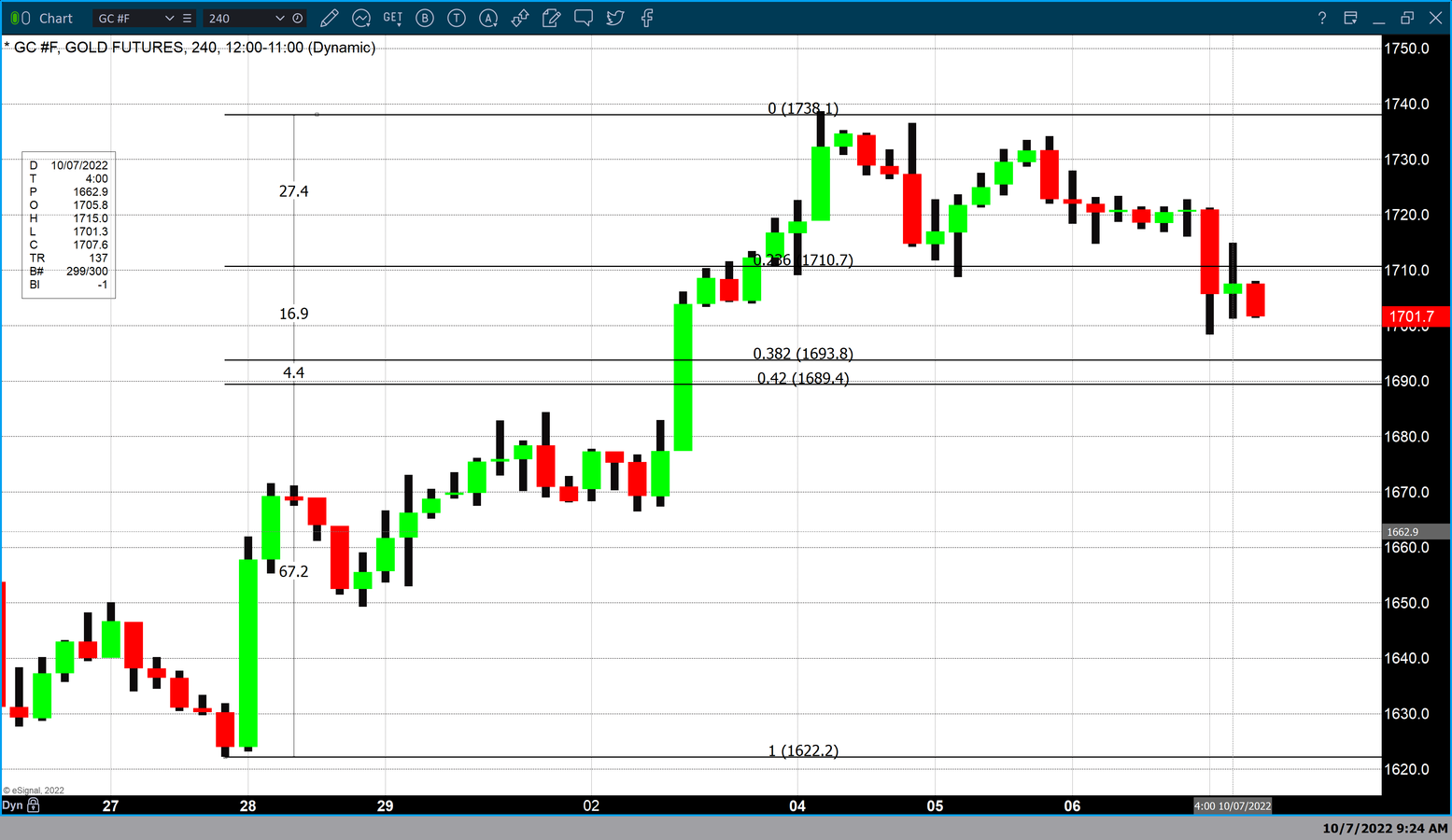 Our technical studies indicate that the first level of resistance occurs at $1710 the 23.6% Fibonacci retracement which is based on a very short-term Fibonacci retracement data set from September 28 to October 7. Major resistance occurs at $1738 the recent high of the rally which began after gold hit its lowest value in years at $1621. The first level of support occurs at $1693.80 the 38.2% Fibonacci retracement and then at $1689.40 a 42% retracement.