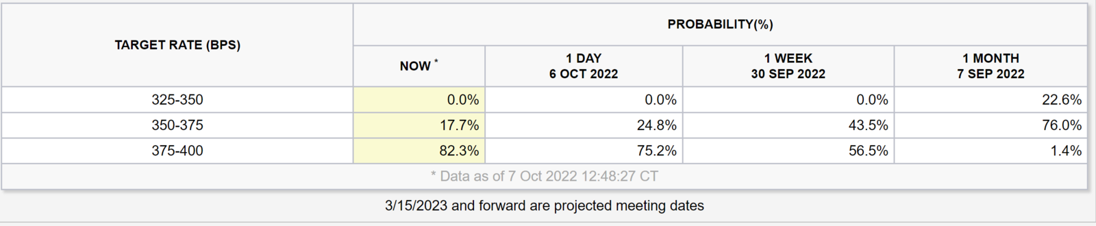 According to CME’s FedWatch tool, last week there was a 56.5%% probability, yesterday there was a 75.2% probability which today swelled to an 82.3% probability that the Federal Reserve will raise rates by 75 basis points for the fourth consecutive time at the November FOMC meeting. This probability indicator forecast the probability of FOMC rate moves by using the 30-day Fed Funds futures pricing data.