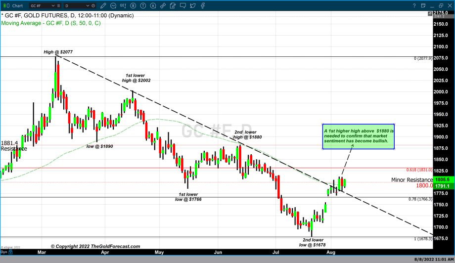 Market participants are looking at Wednesday’s CPI report for July which will act as a catalyst for the next strong move up or down in gold pricing. Early estimates are coming out indicating a slight decline from the 41-year high in June of 9.1% to between 8.7% to 8.8%, this slight difference is based on whether the poll was taken by Bloomberg news or the Wall Street Journal.
