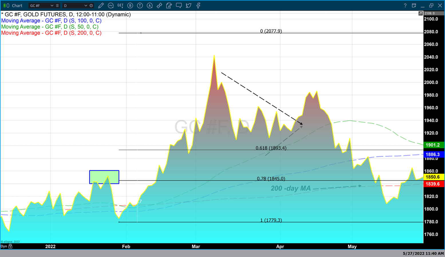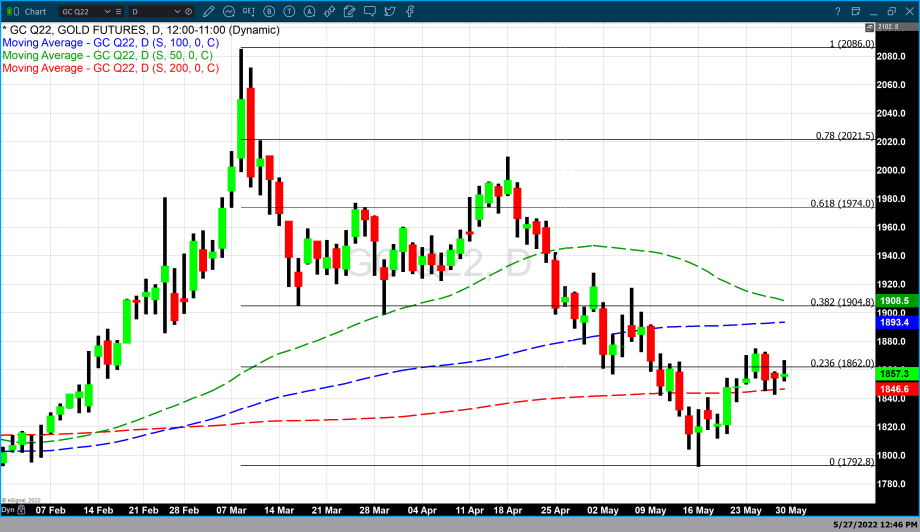Gold had moderate gains today with the June 2022 futures contract currently fixed at $1850.60 after factoring in today’s gain of three dollars.