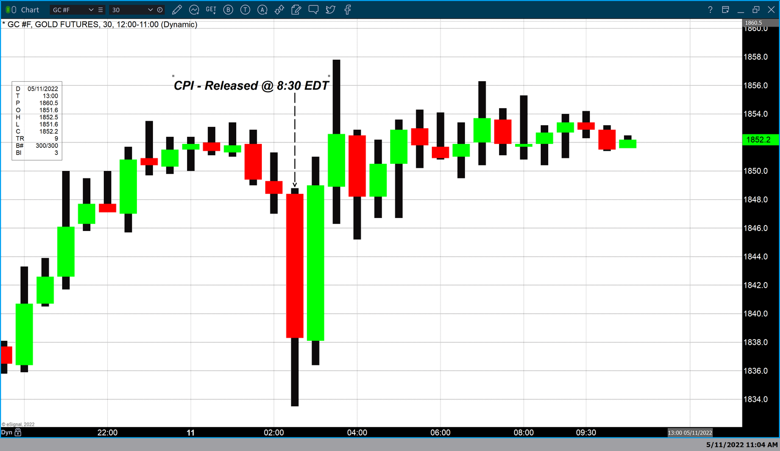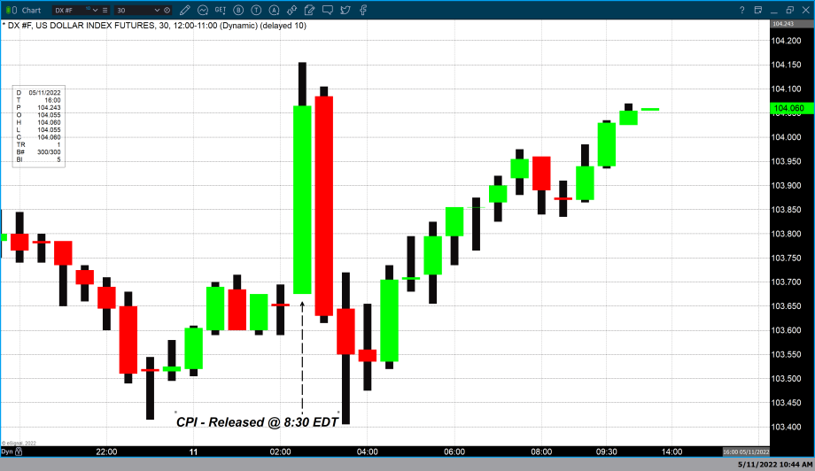 The chart above is a 30-minute candlestick chart of the dollar index. The arrow points to the candle which represents the release time. Beginning at 8:30 AM and concluding at 9:00 AM EDT. The candlestick before that representing 8:00 AM to 8:30 AM EDT shows that the dollar index traded at approximately 103.65 before the release of the report. The dollar index was trading at 103.67 when the BLS released the April CPI report and during the first half-hour after the release of the report traded to a high of 104.15 and closed during that period at 104. 065.