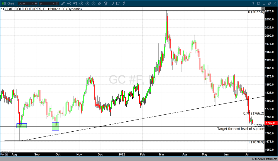 The widely anticipated 75 basis points rate hikes by the Federal Reserve has continued to pressure gold pricing lower. The most active August 2022 futures contract is currently fixed at $1731.90 after factoring in today’s decline of $10.40. Based on our technical studies the first level of potential support comes in at $1720 with major support at $1680.