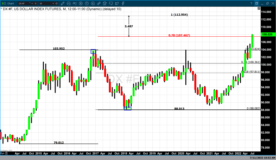 As of 4:45 PM EDT, the dollar has gained 1.11% or a total of 1.184 points and is fixed at 108.005. Our studies indicate that there is no major technical resistance until the dollar index reaches 113. This assessment was created by using a Fibonacci extension from the lows of 79.012 in May 2014 up to the high of 103.952 during the first quarter of 2017.