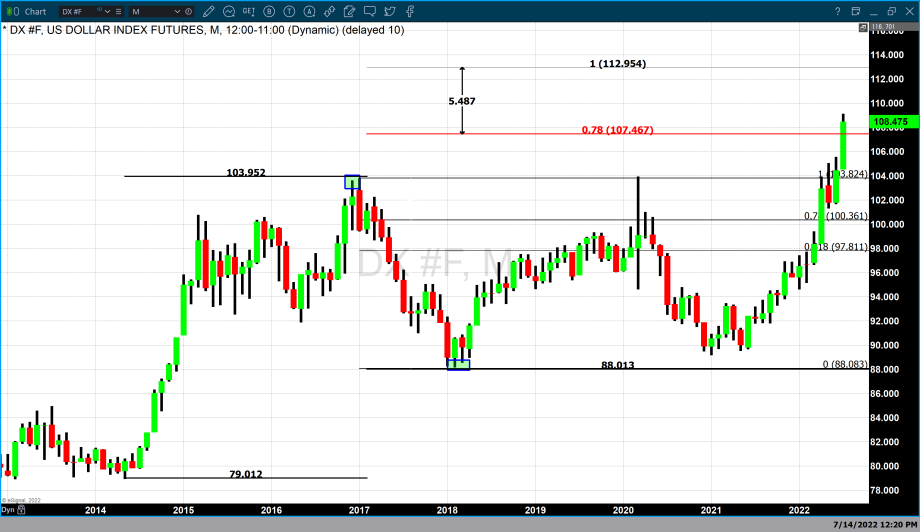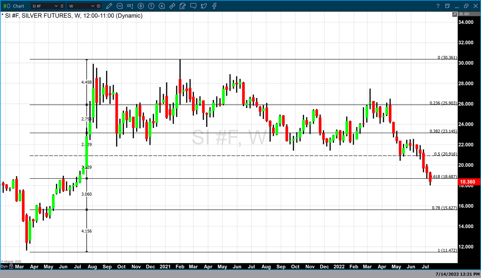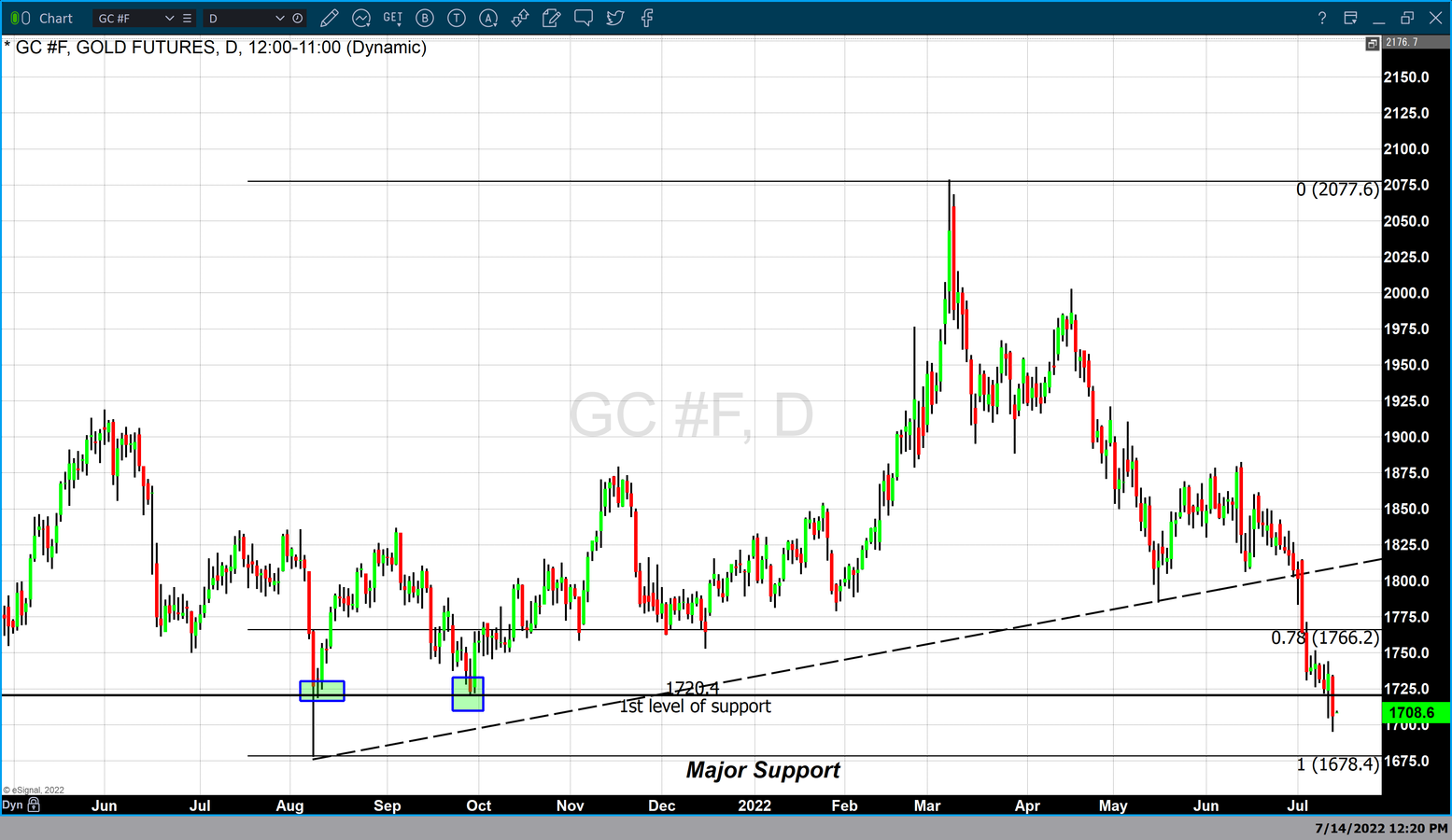 As of 6:13 PM EDT gold futures basis, the most active August contract is currently fixed at $1708.80 declining 1.58% or $27.50. Our studies indicate that there is no technical support until $1680 which matches the low of the flash crash that occurred in August 2021.