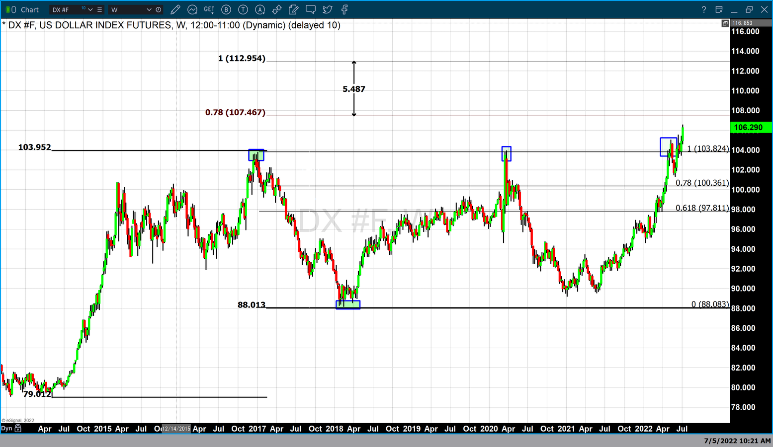 It has been rising interest rates that have been highly supportive of the dollar taking it to a 20-year high today. During the week of June 27, the dollar index opened just under 104 and has gained over 2% in the last six trading sessions. Based on the recent breakout in the dollar, our technical studies indicate that the next level of resistance does not occur until 107.467. Furthermore, it shows that major resistance on a technical level occurs at 112.95.