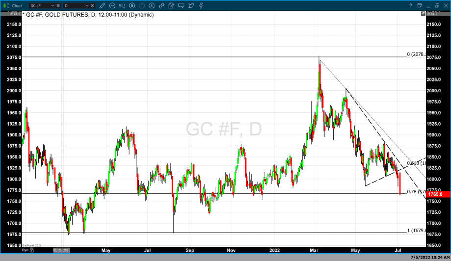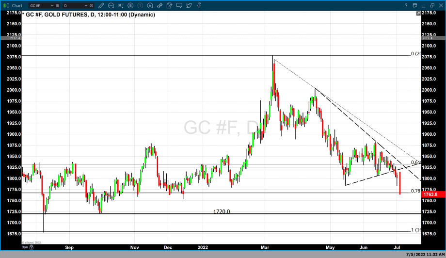 On a technical basis, this caused major chart damage from two important technical studies. First, today’s price decline took gold below its 78% Fibonacci retracement. The data set used for this retracement series begins in August 2020 when gold traded to a low of $1671 up to the high in March 2022 of $2078. The second technical study used to confirm that gold has sustained technical chart damage is a compression triangle. Today’s strong price decline took gold pricing through the lower support trendline. The support trendline was created by fixing the two most recent higher lows. The first low occurred on March 16 when gold traded to a low of $1785 with the second low being fixed at $1805 a low that occurred during mid-June this year.