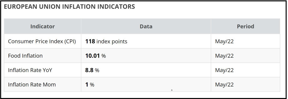 The rate hikes by the Federal Reserve have been in response to exceedingly high levels of inflation which continue to run at a 40-year high. The latest data from the U.S. government indicates that the CPI (Consumer Price Index) was at 8.3% in May. Just as alarming is the most recent economic data from Europe with the May 2022 Consumer Price Index for the Eurozone now fixed at 8.8% YoY.