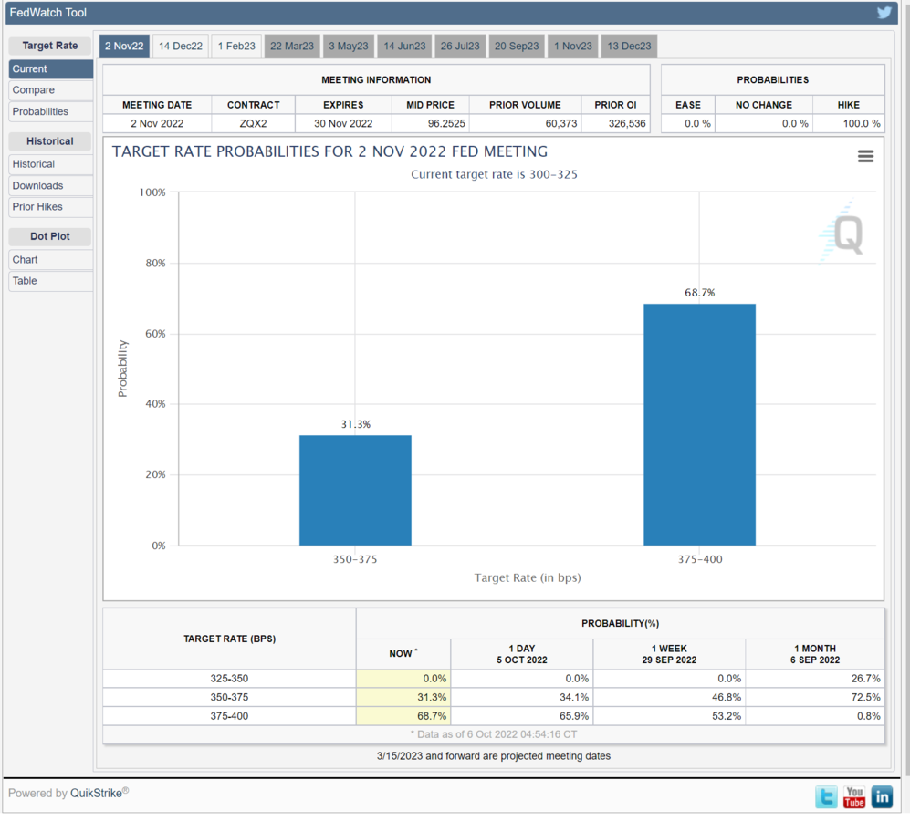 According to the CME’s FedWatch tool, there is a 68.7% probability that the Federal Reserve will raise rates for the fourth consecutive time by 75 basis points. This would take the fed funds rate which is currently at 300 - 325 basis points to 375 - 400 basis points on November 3, the final day of the November FOMC meeting.