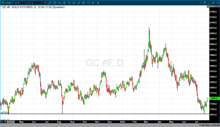 Over the last month, our daily articles have assumed that gold prices were extremely undervalued and oversold. More so, we identified a key price point at $1680 which we believed had a realistic probability to define a major support level in which a key reversal could take place. Because of that assumption we made a recommendation to our premium subscribers on July 14 to enter an order to buy August gold at $1681 or better. On July 21 gold traded to a low of $1678.60 allowing our open order to be executed. Today we recommended closing the trade out and our effective exit price was just above $1745.