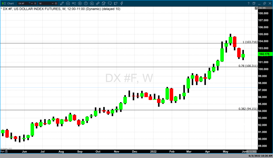 Today’s jobs report resulted in a strong price decline in gold as well as a nominal increase in the value of the dollar. As of 5:15 PM EDT gold futures basis, the most active August 2022 contract is currently fixed at $1853.90 after factoring in today’s decline of almost a full percent (-0.94%) or $17.50. Dollar strength was responsible for roughly 1/3 of today’s decline in gold prices. The dollar gained 0.35% taking the dollar index to 102.185.