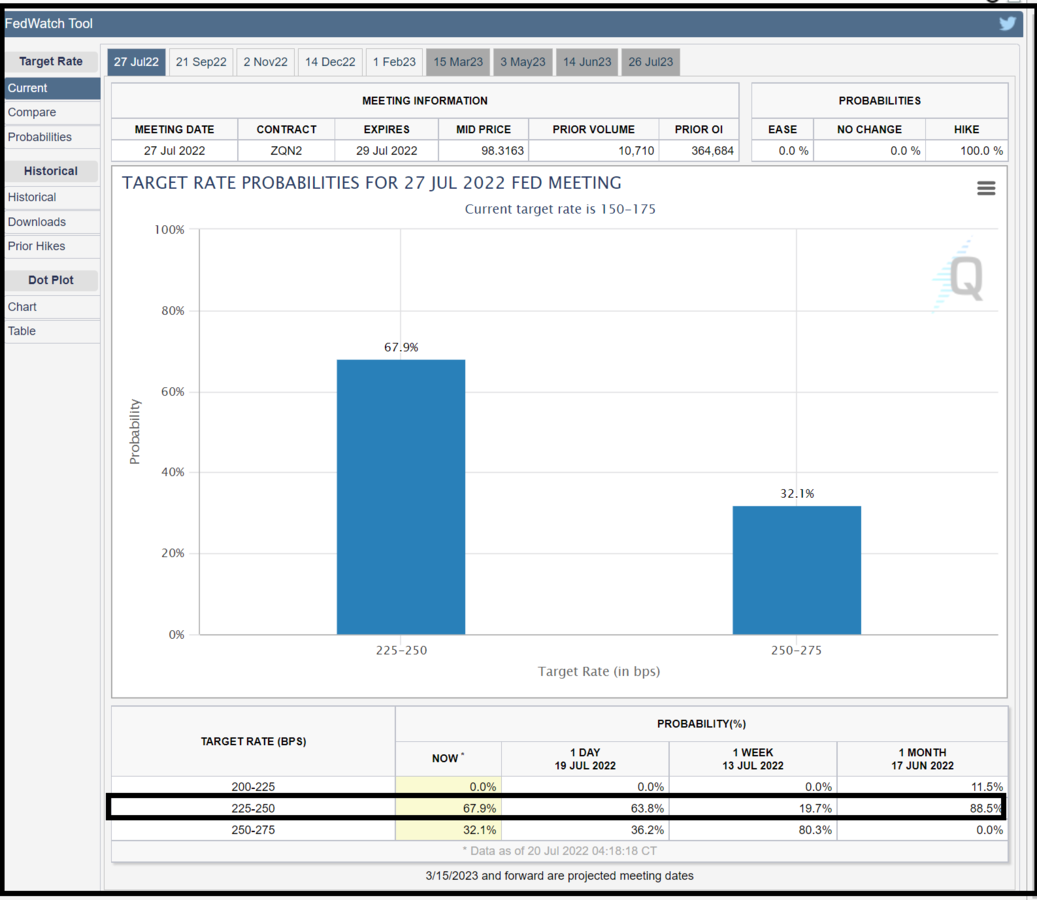 This rate hike indicator has had dramatic shifts in its predictions. One week ago on July 13, the fed watch tool predicted that there was an 80.3% probability of a 100% rate hike and a 19.7% probability of a 75-basis point rate hike. This clearly illustrates how market sentiment continues to shift and change as we get closer to the July FOMC meeting.