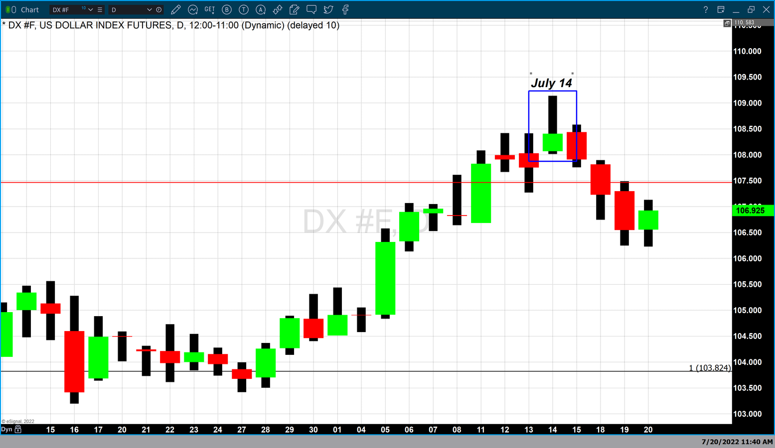 Since last Friday the U.S. dollar has traded under pressure losing value on Friday, Monday, and Tuesday. During the same period gold has been trading under mild selling pressure holding on to a price point just above $1700 per ounce. Recently the dollar hit a high just above 109 on Thursday, July 14 before trading lower for three consecutive days. However, even with dollar weakness for three of the four last trading days gold has not gained any significant value.