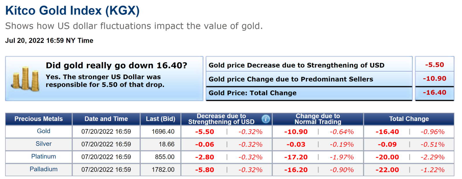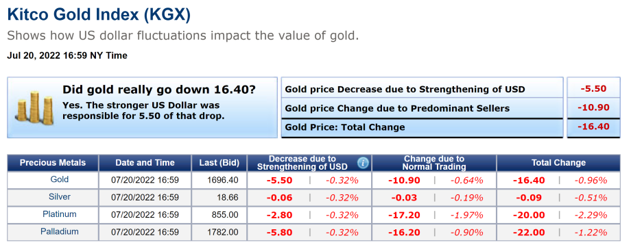 Spot gold is currently fixed at $1696.40 after factoring in today’s decline of $16.40. On closer inspection dollar strength resulted in a $5.50 decline, with the remaining decline of $10.90 directly attributable to selling pressure. This is according to the KGX (Kitco Gold Index).