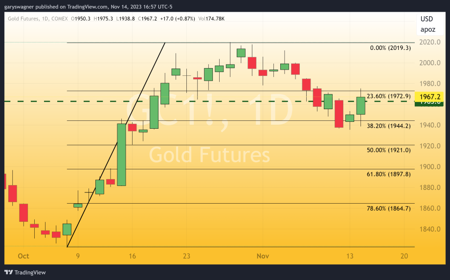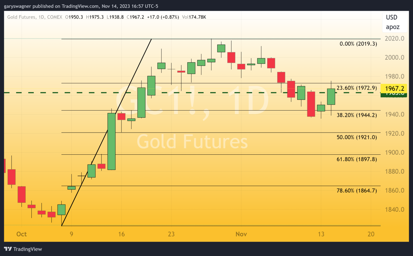 Gold prices exhibited strong gains today with the most active December futures contract gaining $16.50 which is a percentage gain of 0.85%. The real story behind gains in gold comes out of dollar weakness, rather than traders bidding the precious metal higher. The dollar dropped substantially, losing 1.51% taking the index to 103.90. The last time the dollar traded at this low level was September 1 which occurred during a pronounced rally that began at 99.225 and concluded above 106. When you factor in gold’s strong gain today of 0.85% it is just less than half of the decline witnessed in the dollar. Truly today’s gains in gold were the direct result of dollar weakness which was able to overcome moderate selling pressure in the precious yellow metal.