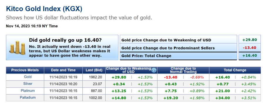This can be best illustrated when looking at spot gold pricing. According to the Kitco gold index physical gold is currently fixed at $1962.20 after factoring in a daily gain of $16.40. However, on closer inspection, dollar weakness added $29.80 with active selling taking away $13.40 of that increase. The selling pressure in gold today (price change minus the effect of dollar weakness) likely can be attributed to traders taking profits on recent short positions.