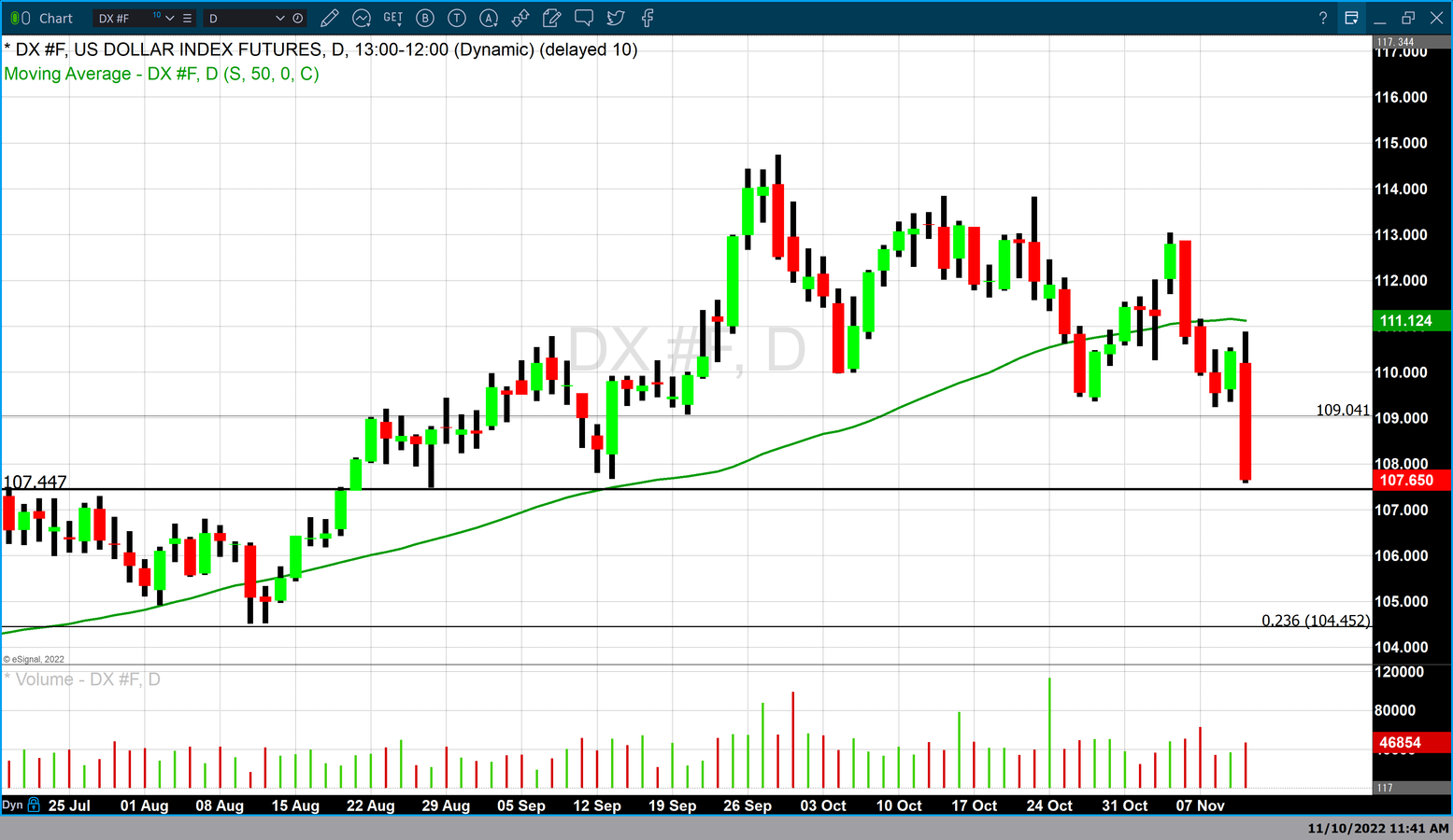 The US dollar had a steep selloff giving up 2.45% with the dollar index currently fixed at 107.75. The largest percentage decline today occurred within government debt instruments such as Treasury Bonds and Notes. The CBOE 10-year Note futures contract declined by 7.76% and is currently yielding 3.829%. Futures on 30-year Treasuries declined by 5.53% and are currently yielding 4.081%.
