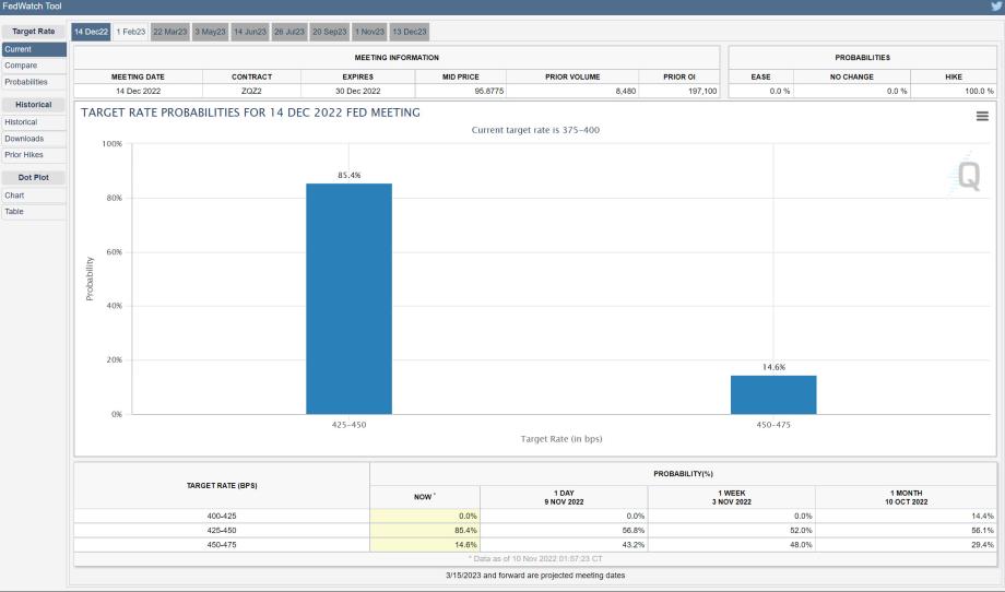 According to the CME’s FedWatch tool, there is an 80.6% probability that the Fed will raise rates by 50 basis points in December rather than 75 basis points which now has only a 19.4% probability of occurrence. Most noteworthy is the net change in the probability of a 50-basis point rate hike in December which was at 56.8% yesterday and over 80% today.