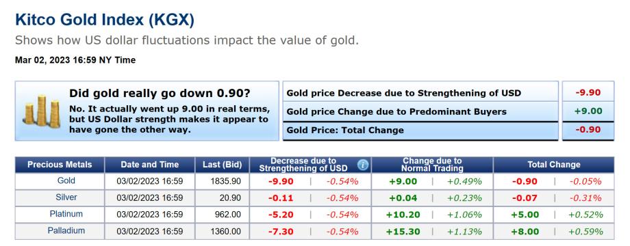 One of the best ways to illustrate that point is to look at the spot pricing of gold and silver through the eyes of the Kitco Gold Index (KGX). The screen-print of the KGX was taken at approximately 6 PM EST and shows that the price of spot gold is $1835.90 and $20.90 for spot silver.