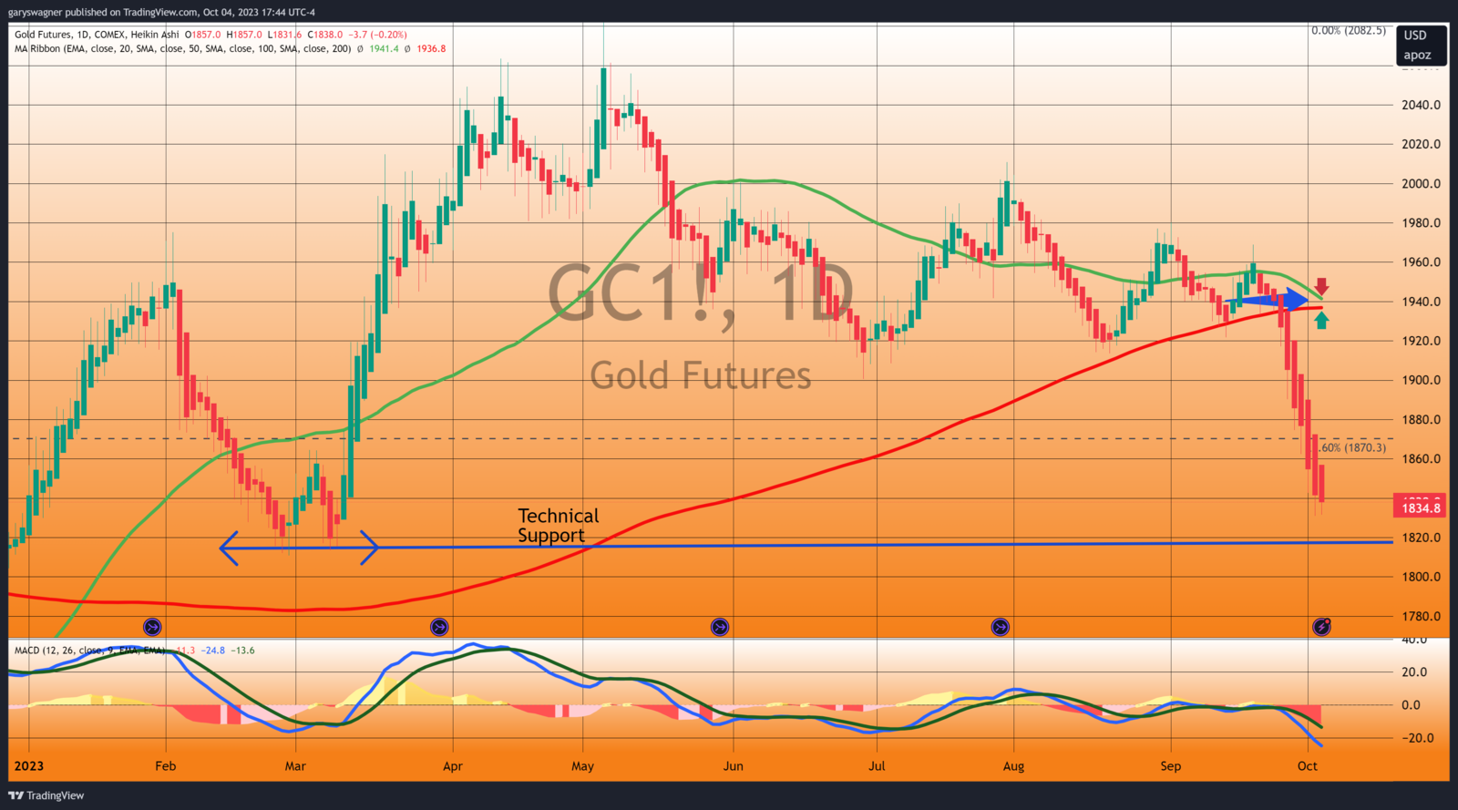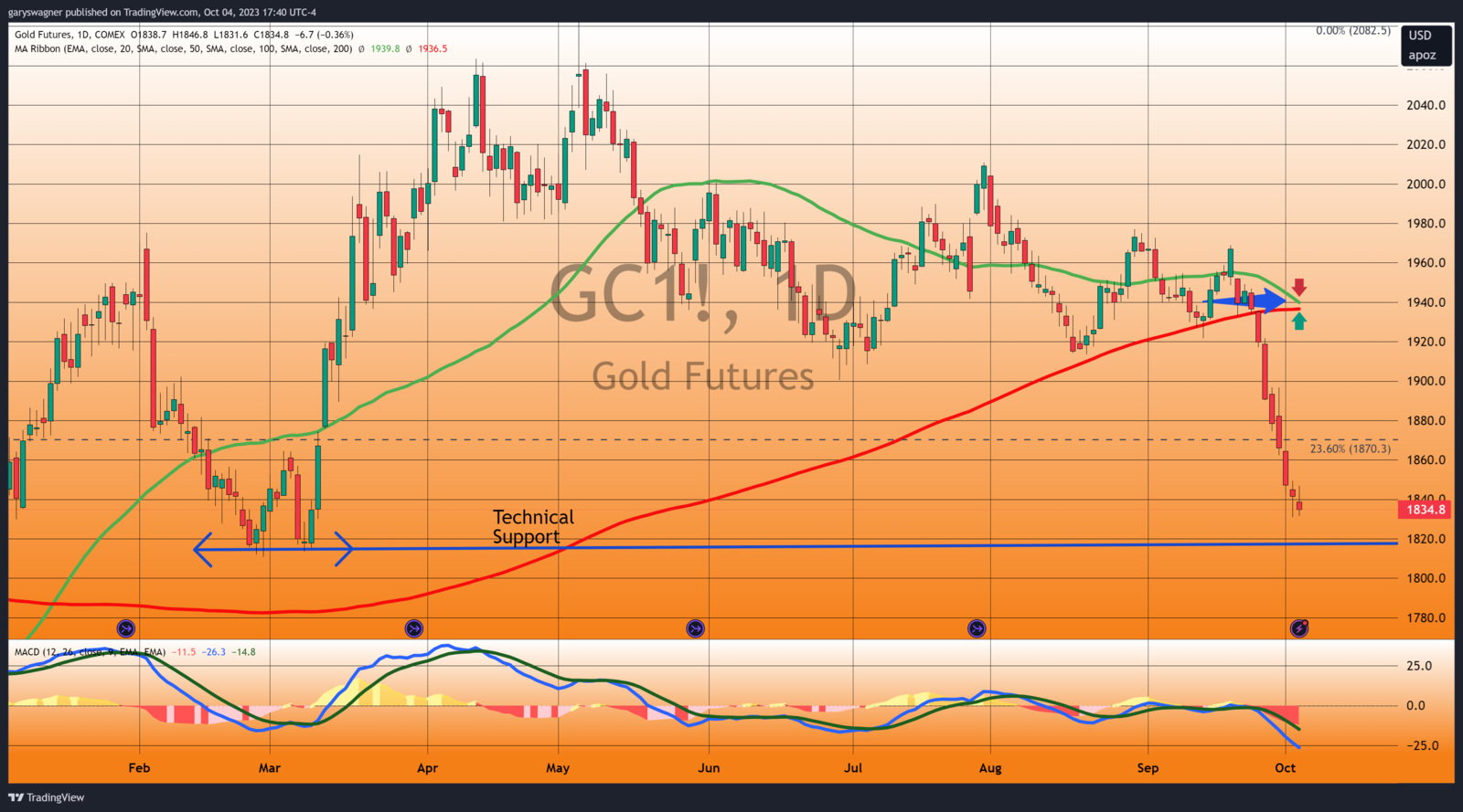 Despite Dollar weakness and yields declining gold futures continued to trade lower. The most active December futures contract opened at $1838.70 and is currently fixed at $1834.80 after factoring in today’s decline of $6.70 or – 0.36%. Gold futures fell to their lowest value since a double bottom formed at the end of February and the beginning of March. The chart below is a daily candlestick chart of the continuous futures contract of gold which contains the MACD which indicates that gold prices are oversold. However, the two moving averages are moving very close to the formation of a death cross, which is created when the short-term 50-day moving average (solid green line) crosses below the long-term 200-day moving average (solid red line).
