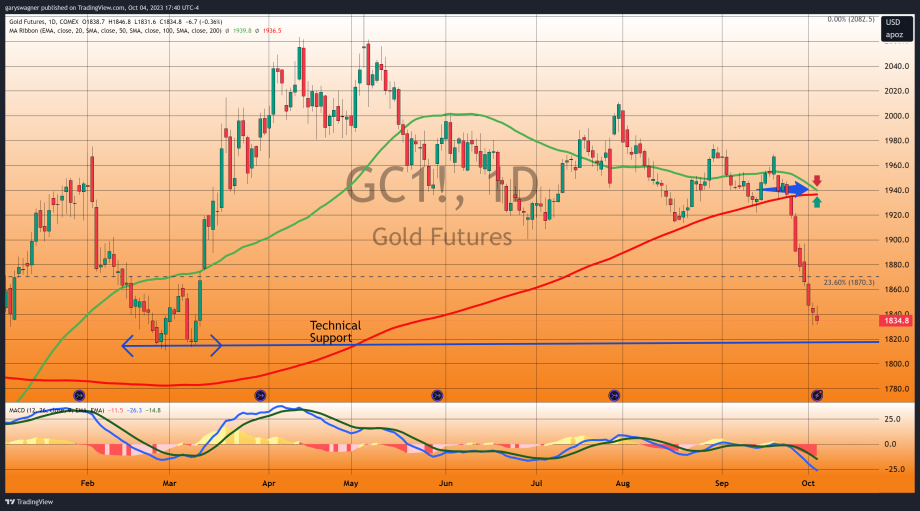Recent pressure has resulted in eight consecutive price declines with each daily candlestick trading to a lower low, a lower high, and a lower close than the previous day. The eight daily candlesticks are also colored in red which is significant because it indicates that gold futures closed below their opening price. The one caveat to the decline over the last two days is the contraction of the real body size (the rectangle drawn around the open and closing price).