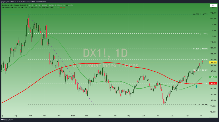 The dollar opened at 106.81, traded to an intraday high of 106.97 (just below yesterday’s high), and then traded to a lower low and lower close than yesterday. Currently, the dollar index is down - 0.18% and fixed at 106.53. The chart below is a long-term daily Japanese candlestick chart of the dollar index. We have created a Fibonacci retracement from a data set beginning at the high of 114.65 achieved on September 27, 2022, to the low of 99.26 which occurred on July 18. The intraday high from both yesterday and today roughly matches the 50% retracement at 107.02.