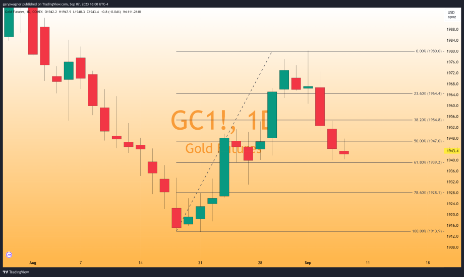 Gold has been in a short-term corrective cycle after gold traded to a high on September 1 of $1979.69. This concluded the rally that began on Thursday, August 17 after gold hit an intraday low of $1916.40. Current pricing takes gold futures from the recent high just below $1980 to $1943.70 which is in approximately a 61.8% Fibonacci retracement which occurs at $1939.20.