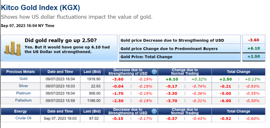 Spot gold is up $2.50 today and is currently fixed at $1918.30. But on closer inspection according to the Kitco Gold Index (KGX), spot gold gained $6.10 due to normal trading however, lost $3.60 The result of dollar strength when combined the result was fractional gains of $2.50 per ounce.