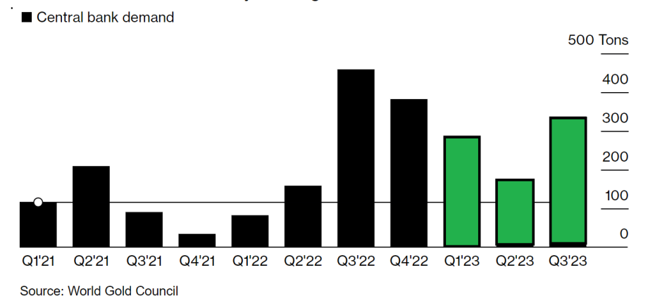 The World Gold Council has updated its list of gold reserves by countries revealing that many central banks aggressively added to their gold reserves. Collectively these purchases by global central banks are at a record pace for the first three quarters of 2023 which totals 800 tons, with China Poland, and Singapore being the primary buyers. This pace is well above the total purchases for the same period in 2022.