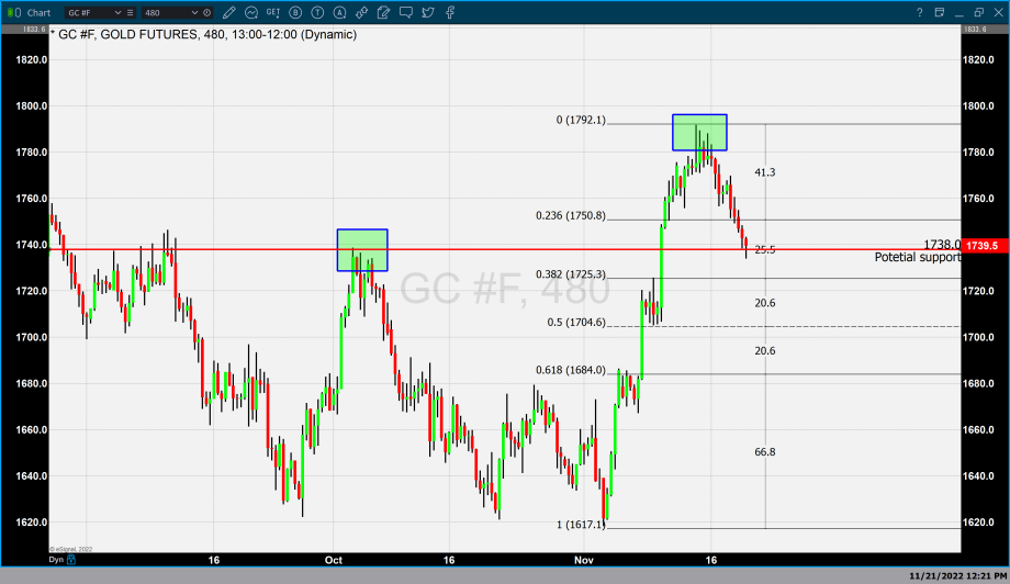The anticipation of the November minutes along with statements made throughout last week has continued to pressure gold lower. As of 5:15 PM EST gold futures basis, the most active December contract is currently fixed at $1739.50 after factoring in today’s decline of $14.90 or 0.85%. Interestingly the percentage decline in gold today matches the percentage gain in dollar strength. The dollar is currently fixed at 107.705 which is a net gain of 0.82%.