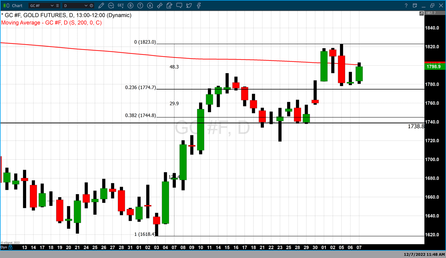 Gold futures basis the most active February 2023 contract opened in New York at $1783.30 and traded to a high of $1803.20 just above its 200-day moving average which is currently fixed at $1800.70. The price point of this long-term moving average at least for the short term became a technical level of resistance moving gold back below it. As of 4:19 PM EST, the February contract of gold futures is currently fixed at $1798.90 after factoring in today’s net gain of $16.50 or 0.93%.