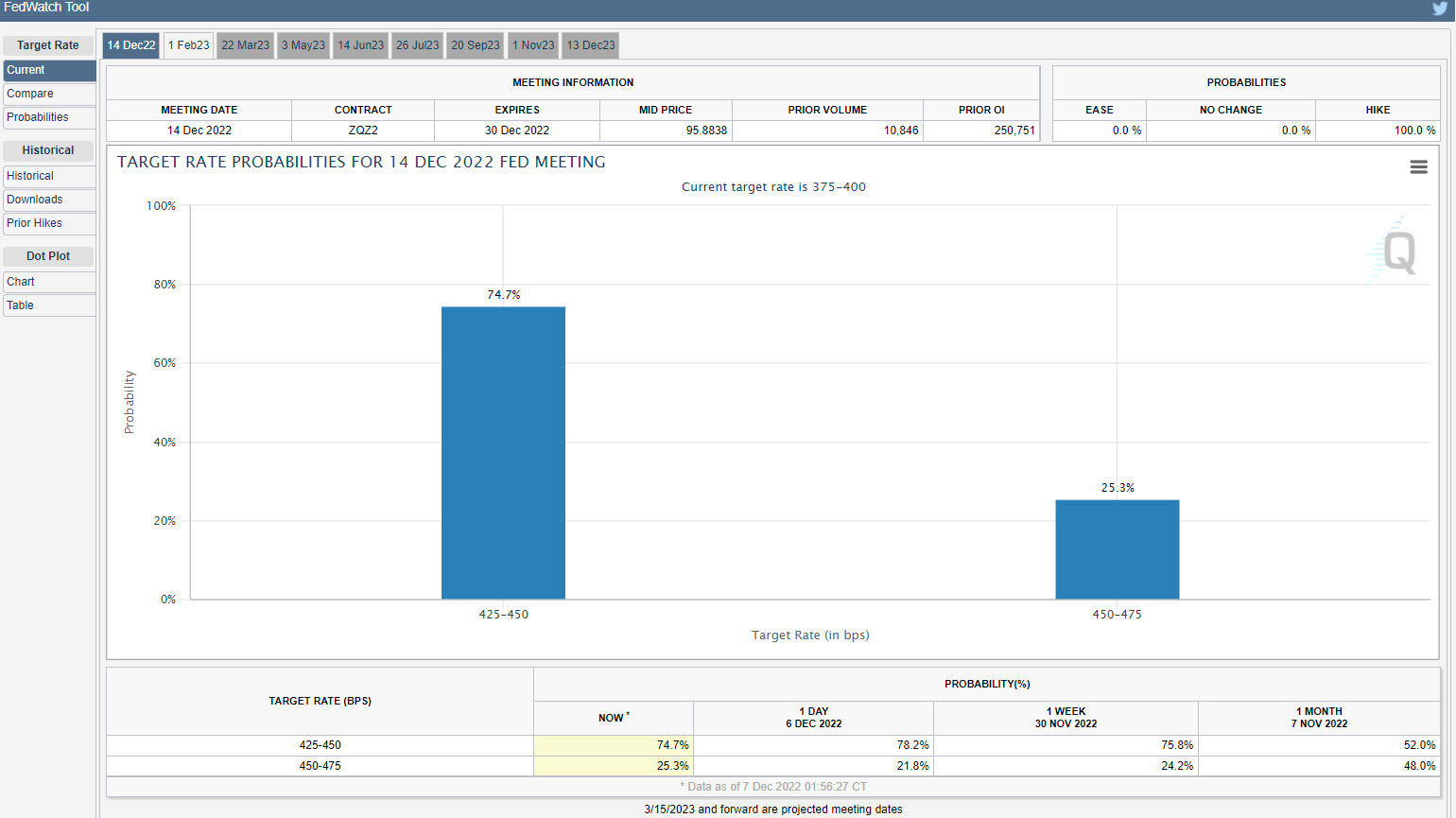 Traders and investors have largely priced in the high likelihood that the Fed will raise rates by 50 basis points, or a ½ %. This will take the current target rate of 375 - 400 basis points to 425 - 450 basis points by the end of the year. According to the CME’s FedWatch tool, there is a 74.7% probability of a 50-basis point rate hike and a 25.3% probability of a 75-basis point rate hike. It is the possibility, although remote, of a fifth consecutive rate hike of 75 basis points that continues to give market participants angst about the upcoming meeting.