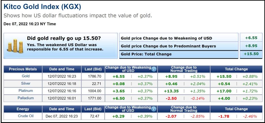 That same ratio can be seen in today’s pricing of physical gold. According to the Kitco Gold Index (KGX), spot gold as of 4:23 PM EST was fixed at $1786.70 after factoring in a net gain today of $15.50. Dollar weakness accounted for $6.55 of the $15.50 gain with the rest attributable to buyers bidding gold prices higher by $8.95.