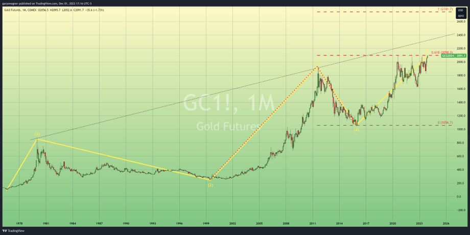 With this in mind, it is quite realistic to assume that gold could continue to challenge its record-high close. The chart above is a projection created this week using a combination of Elliott wave theory and Fibonacci extensions. It uses a model based on the ratio of impulse waves three and five. The most simplistic model states the relationship of the price gains in wave five is approximately 0.618% of the price gains found in wave three. Using this methodology, it is projecting the high to be achieved after a major Supercycle from 1975 to 2023 to be $2072.