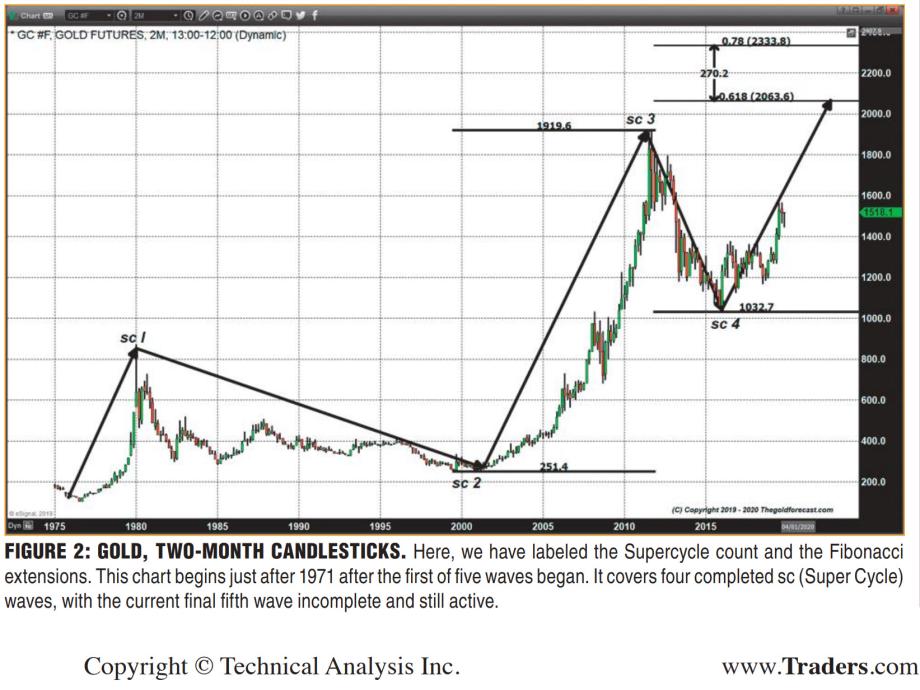 In 2016 I co-authored a piece with my son Joseph Wagner titled “Gold’s Super Cycle” in Technical Analysis of Stocks and Commodities (TASC) in which we put forth a model of gold’s super cycle that began in the 1970s following Nixon’s final step to abolish the gold standard. The decoupling of gold and the US dollar kicked off a supercycle in the precious metal spanning over 50 years, the impulse phase of which (waves one through five) could have very well been completed today.