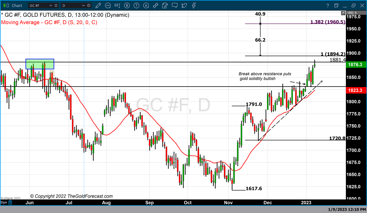 Today gold futures traded to an intraday high of $1886 before settling approximately $10 lower at the time of this writing. Our technical studies indicate that gold futures could find potential resistance at $1881 which is based upon a top that occurred at the end of June 2022. Gold futures did trade above that price point but closed below it suggests possible resistance at the top created in June.
