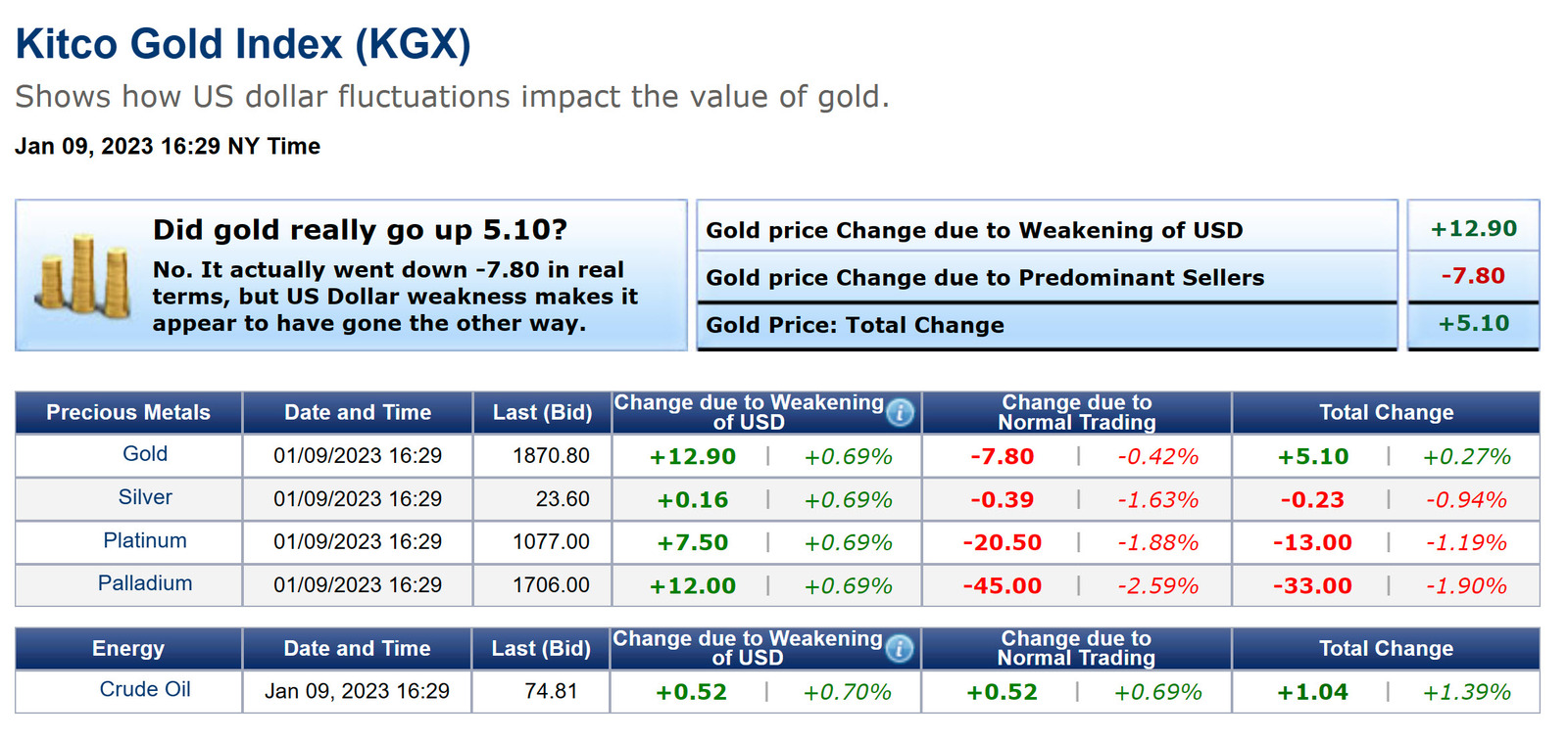 The same is true for spot or physical gold. According to the KGX, (Kitco Gold Index) spot gold is currently fixed at $1870.80 after factoring in today’s gain of $5.10. However, on closer inspection dollar weakness resulted in gains of $12.90 per ounce, and selling pressure took gold lower by $7.80 resulting in today’s moderate gain.