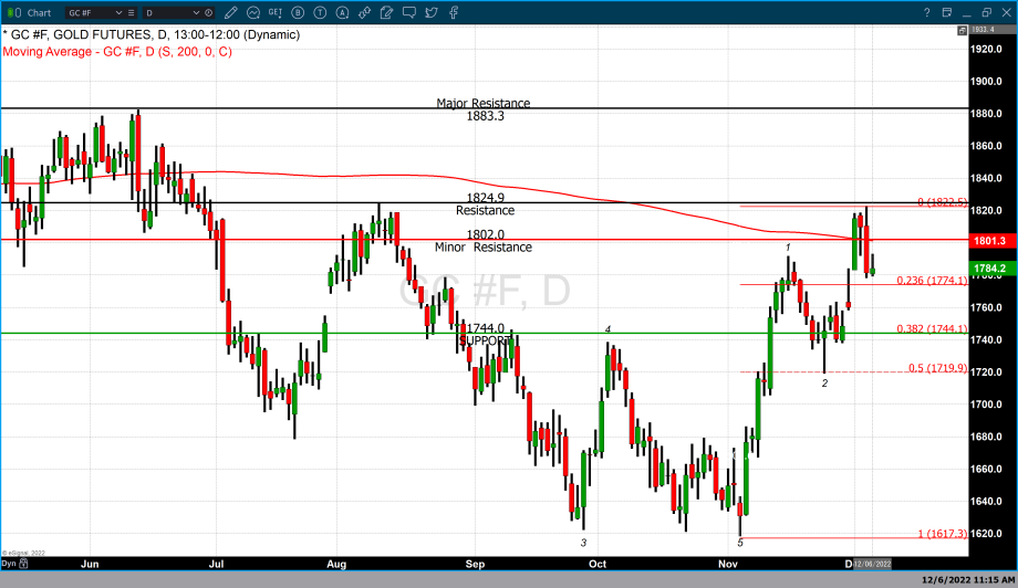 Minor support first occurs at $1775 which corresponds to the 23.6% Fibonacci retracement. Major support occurs between $1720 the 50% retracement and $1745 the 38.2% Fibonacci retracement level.