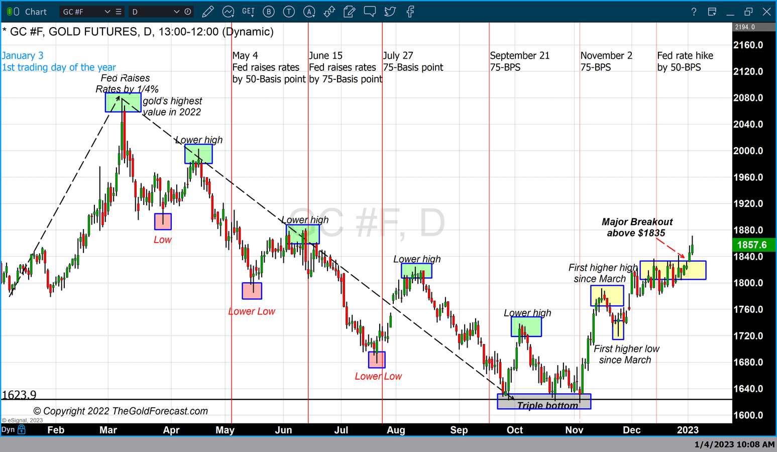 Gold prices maintained the morning gains following the release of last month’s FOMC meeting minutes at 2:00 PM EST. Gold futures opened today at $1845.20 and traded to an intraday high of $1871.30. As of 2:45 PM EST, the most active February 2023 contract is fixed at $1857.40 after factoring in today’s price gain of $11.60.