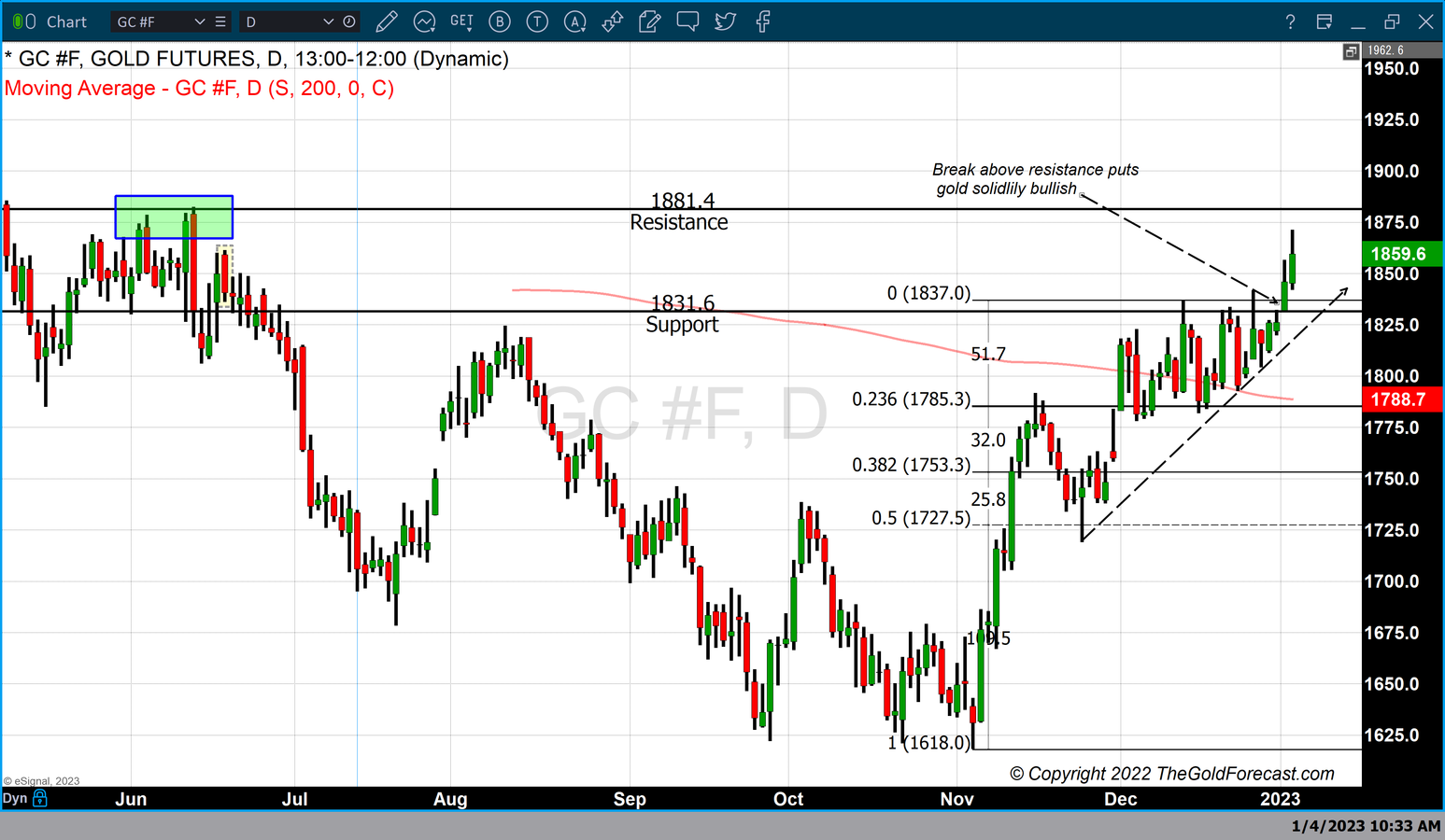 It is a fact that market sentiment for gold had a major price reversal from exceedingly bearish to bullish beginning in November 2022. Our technical studies indicate that the current level of major support is $1831. This support is based on yesterday’s low. Resistance occurs at $1881.50, based on two tops that occurred in mid-November and mid-June 2022.
