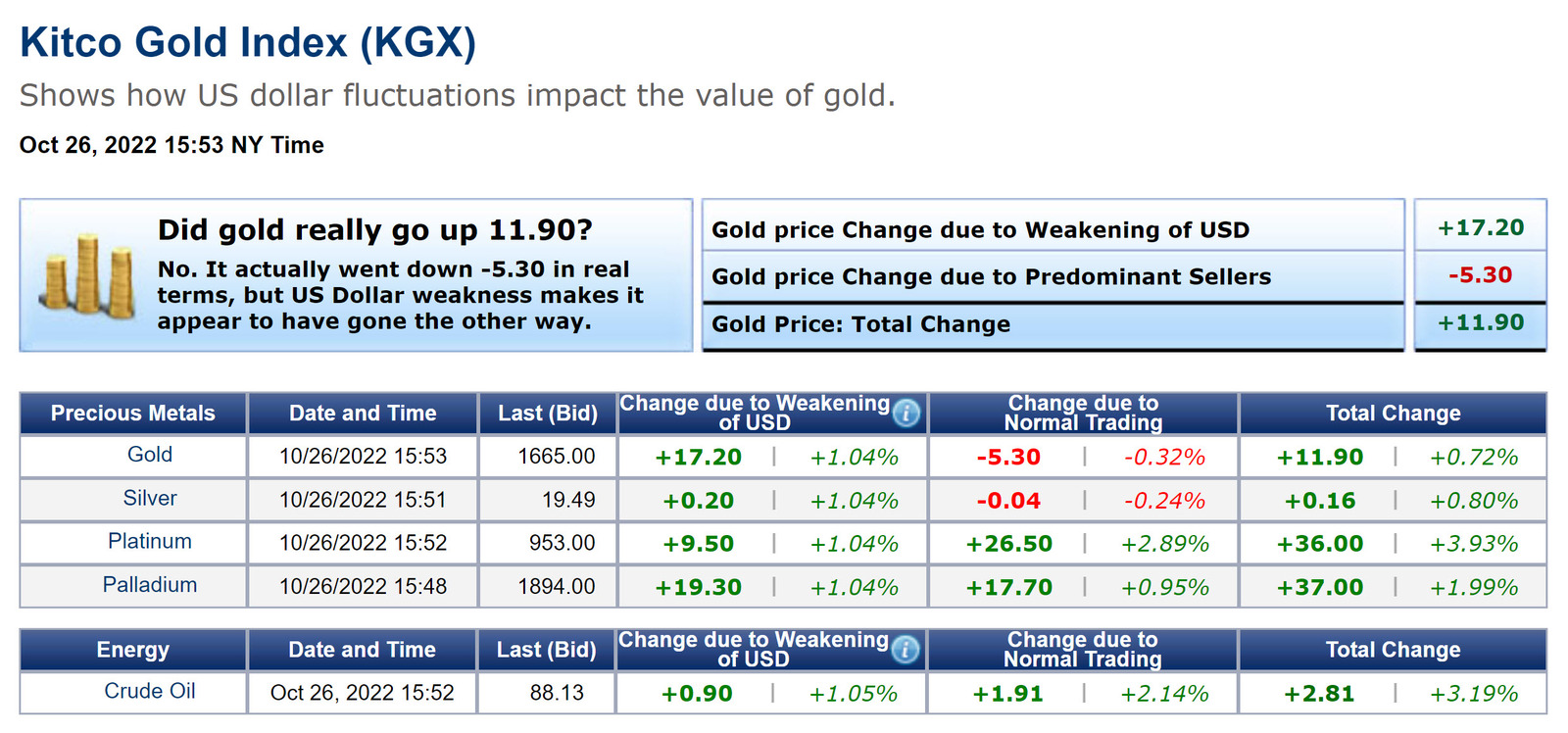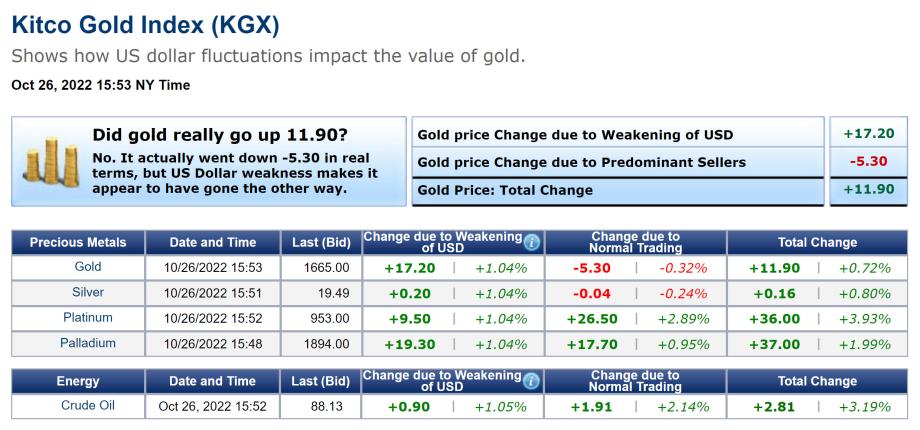 As of 4:05 PM EDT, the dollar index is down 1.290 points or 1.16% and fixed at 109.54. The lack of market participants bidding gold higher can be seen through the eyes of the Kitco Gold Index (KGX). The screen print above of the KGC was taken at 3:53 PM EDT and shows spot gold was currently fixed at $1665 with a net gain of $11.90. However, as we have seen on multiple occasions recently it was dollar weakness that moved spot gold pricing up by $17.20, and selling pressure taking gold lower by $5.30.