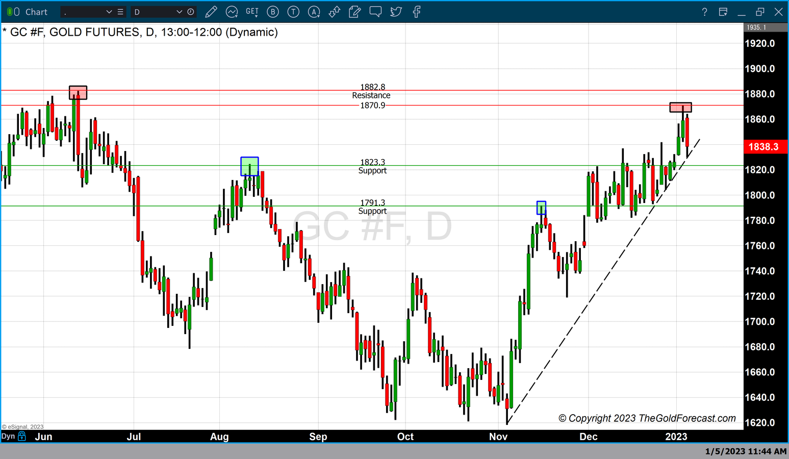 The two most recent tops occur at $1823 (August 2022) and $1791 (November 2022) which continue to be technical levels of support. Noteworthy is the fact that the support trendline covering recent lows from November to current pricing remains intact.