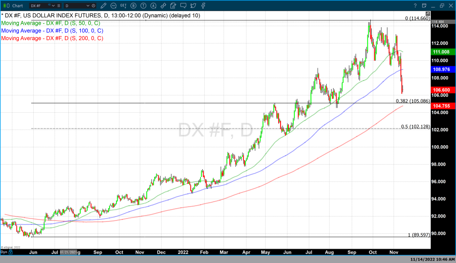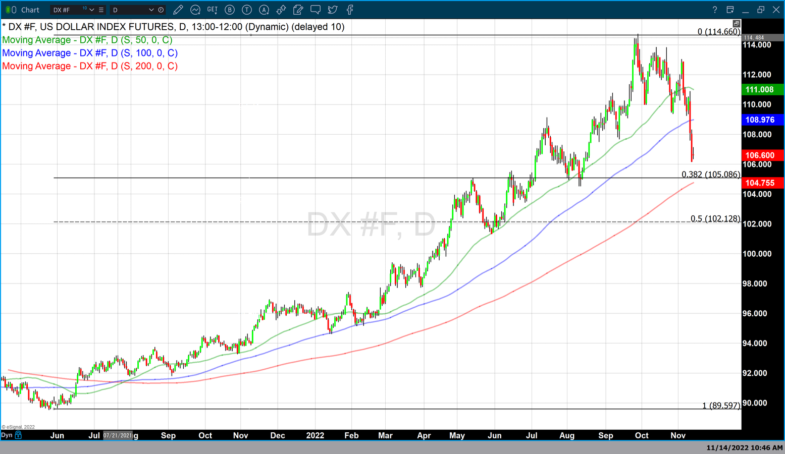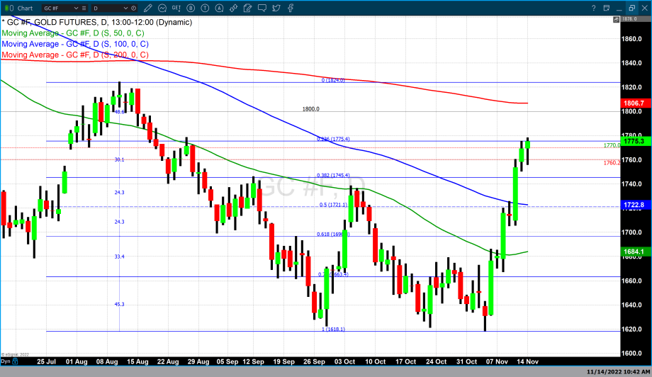 As of 3:33 PM, EST gold futures basis most active December 2022 contract is trading up $6.60 or 0.37% and fixed at $1776. This is just a few dollars off today’s high of $1778.40. Today’s gains in gold futures are occurring concurrently with dollar strength which has made today’s moderate gains even more impressive. Today the dollar index has gained +0.42% and is currently fixed at 106.605. After trading to a low of 106.20 on Friday the dollar has had a fractional recovery from those lows.