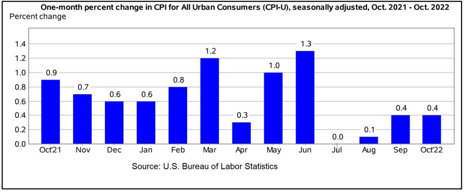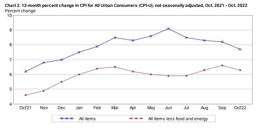 The table below is a month-by-month table of CPI from October 2021 to October 2022 issued by the US Bureau of Labor Statistics. Last week’s CPI report revealed that inflation had a fractional decline moving from 8.2% in September to 7.7% year-over-year in October. Inflation has been elevated for an extended time considering that one year ago (Oct. 2021) headline inflation was over 6% and now in 2022 the CPI hasn’t declined but rather is higher than last Halloween when it felt like it might still be a trick. Now the public is aware that they were treated instead to a constantly climbing cost of living.
