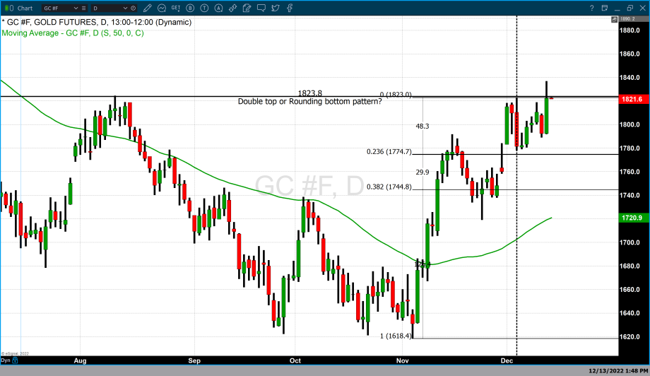 Gold had a strong upside move breaking above $1800 after opening at $1792.30 this morning in New York. As of 4:30 PM EST gold futures basis, the most active February 2023 Comex contract is fixed at $1822.20, after factoring in today’s large gain of $29.80 or 1.66%.