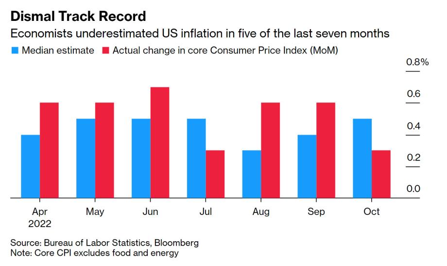 The fact that inflation declined to 7.1% year-over-year below the economist’s forecasts of 7.3% could be the needed data for the Federal reserves to slow the pace of rate hikes with a 25-bps rate hike in February rather than a 50-bps hike as formerly anticipated. In fact, the experts have had a “dismal track record” in estimating U.S. inflation. As the graph above released yesterday by Bloomberg News shows, the experts have incorrectly underestimated inflation in the United States only twice in the last seven months.
