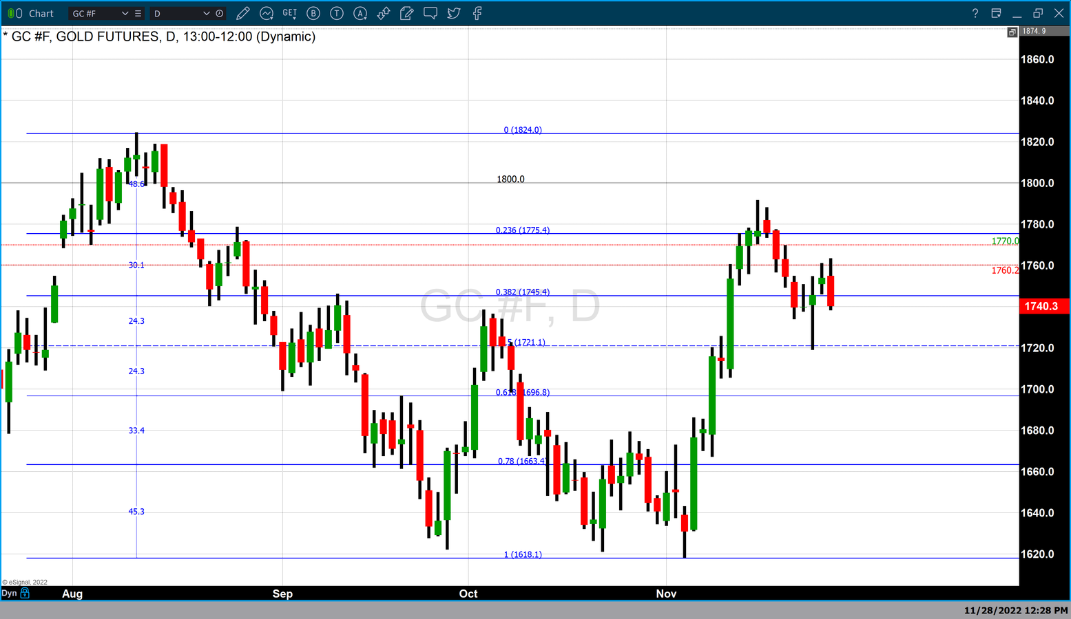 As of 4:48 PM EST gold futures basis of the December 2022 Comex contract is fixed at $1740 after factoring in today’s decline of $14 or -0.80%. The most active or front month for gold futures will change from December to February 2023 within days. Currently, the February 2023 contract of Comex gold is down $14.10 and fixed at $1754.70.