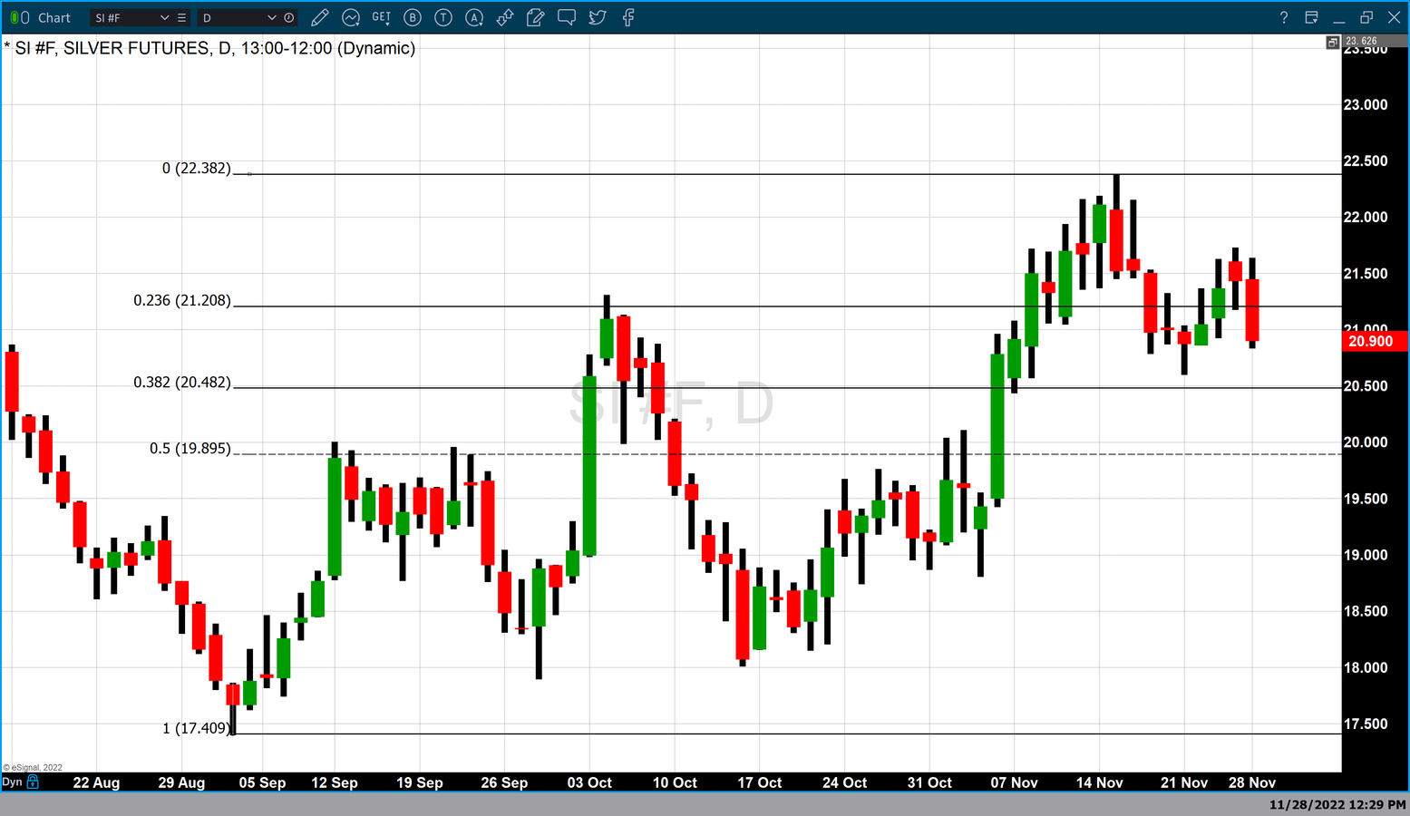 The December contract of silver futures is also trading lower today. Currently, December futures are down -2.59% or $0.56 and fixed at $20.87. The most active front month in silver futures is also moving from December to the March 2023 contract which is currently down 54.9 cents or -2.59% and fixed at $21.065.