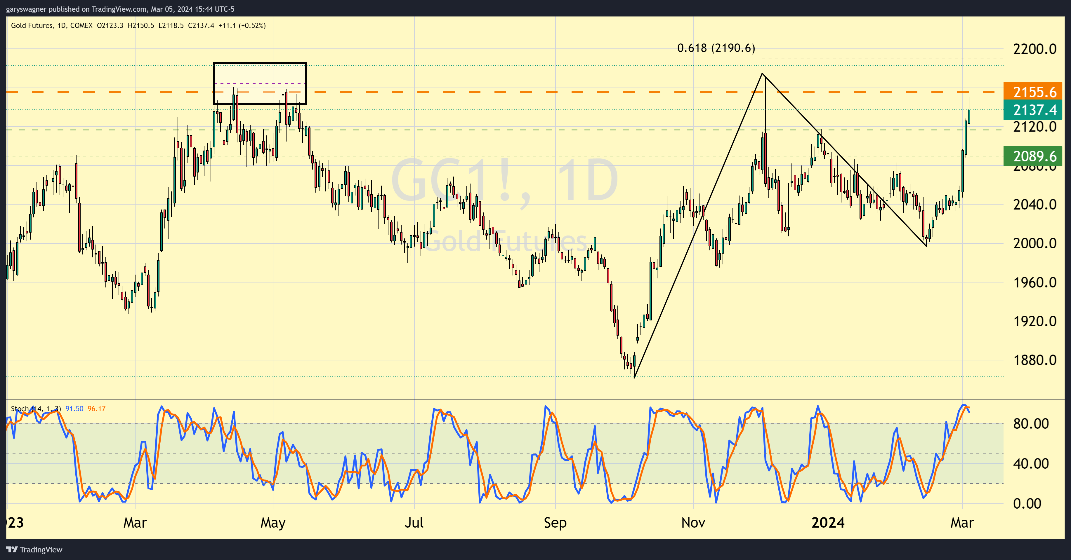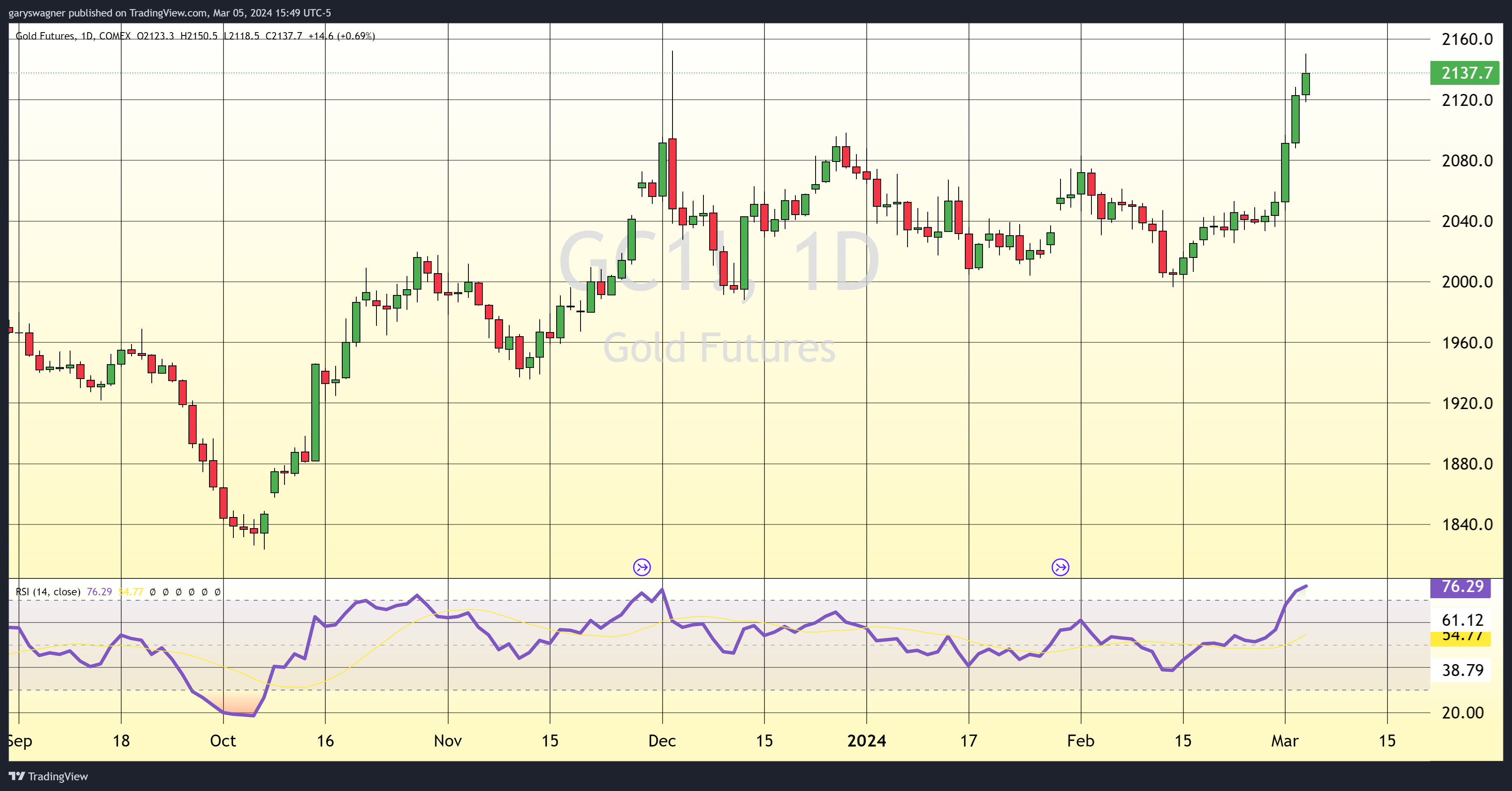 Gold continues its dynamic rally moving to higher ground for the fourth consecutive day, with the last three consecutive days resulting in a new record settlement price. As of 4:00 PM ET, gold futures basis the most active April contract is currently trading up $11.70 and fixed at $2138.20. However, today gold futures are trading well off of $2150.50 its intraday high, the first occasion in the last few days in which gold has not closed near or at its daily high.