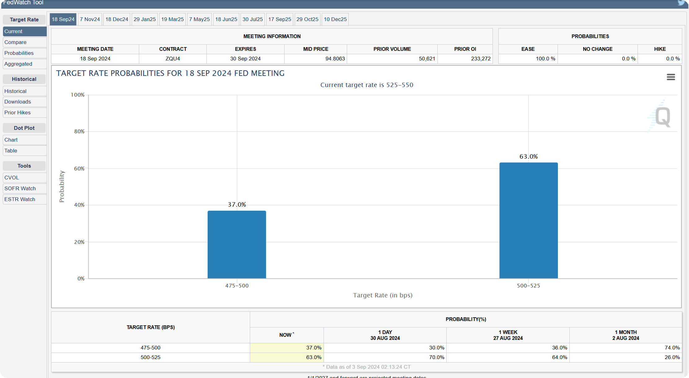 Currently, the CME's FedWatch tool indicates a 100% probability of a rate cut in September, with a 63% chance of a 25-basis point reduction and a 37% likelihood of a more substantial 50-basis point cut.